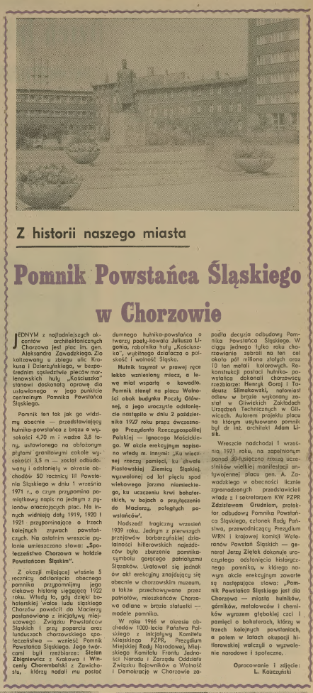 Na terenie Chorzowa znajduje się wiele obiektów memoratywnych upamiętniających ważne dla naszego miasta wydarzenia historyczne, postacie oraz miejsca. Większość z nich jest związana z powstaniami śląskim z lat oraz z II wojną światową. Najczęściej mają one formę pomników i tablic pamiątkowych, ale są to także liczne nagrobki osób związanych z tymi wydarzeniami. W okresie międzywojennym powstało wiele trwałych upamiętnień trzech śląskich powstańczych zrywów, a zwłaszcza trzeciego, które doprowadziło, mimo niekorzystnego wyniku plebiscytu z marca 1921 r. do przyłączenia do Polski znacznej części Górnego Śląska, w tym ważnych obszarów przemysłowych. Aby godnie upamiętnić te wydarzenia już w 1927 r. na placu przy budynku Poczty Głównej (w miejscu dzisiejszej fontanny) i słynnych schodów prowadzących na wiadukt w kierunku huty „Królewska”, stanął Pomnik Powstańca Śląskiego, symbolizujący walkę i ciężką pracę ludu śląskiego, dążącego do przyłączenia Górnego Śląska do Polski. Projektantem monumentu odsłoniętego uroczyście 2 października 1927 r. w obecności ówczesnego prezydenta RP Ignacego Mościckiego był krakowski artysta rzeźbiarz Stefan Zbigniewicz, a wykonawcą rzeźbiarz Wincenty Chorembalski z Zawichostu. Pomnik przedstawiał powstańca – muskularnego hutnika, do pasa obnażonego, mającego twarz Juliusza Ligonia, poety – kowala pracującego w hucie Królewska, ubranego w duży skórzany fartuch hutniczy. W lewej ręce trzymał młot kowalski, wsparty na kowadle zaś w prawej uniesiony lekko miecz skierowany w kierunku niemieckiego wówczas Bytomia. Niestety pomnik został zniszczony we wrześniu 1939 r. Po wojnie w 1946 r. na zachowanym pustym cokole ustawiono tzw. statuę Orła Białego ku czci wszystkich poległych powstańców. Stała ona w tym miejscu do początków lat 70. ubiegłego wieku. Wówczas podjęto decyzję o rekonstrukcji przedwojennego monumentu, lecz wybrano dla niej inną lokalizację na placu obok dawnej Hali Targowej z 1905 r., zabudowań rzeźni z 1901 r. i miejskiego targowiska na dzisiejszym Placu Powstańców Śląskich. Miejskie targowisko w latach 60-tych XX w. przeniesiono na ul. Barską, a hali targowej nadano nowy socrealistyczny kostium architektoniczny. Nowy pomnik przy zachowaniu zasadniczych cech pierwotnego założenia zrekonstruowany został przez chorzowskich artystów rzeźbiarzy: Henryka Goraja i Tadeusza Ślimakowskiego. Założenie architektoniczne placu z sześcioma pylonami (2 x po 3) symbolizującymi trzy zrywy powstańcze, usytuowanymi wokół pomnika wykonane zostało wg projektu prof. Adama Lisika. Sam brązowy odlew pomnika wysoki na 4,70 m i wadze 3,8 tony ponownie jak ten przedwojenny również ma twarz Juliusza Ligonia. Odlana w Gliwickich Zakładach Urządzeń Technicznych postać stanęła na granitowym postumencie o wysokości 3,5 m ustawionym w centralnym punkcie placu. Tym razem postać powstańca – hutnika twarz ma skierowaną w kierunku huty, w której Ligoń pracował, a trzymany w prawej ręce miecz jest opuszczony i oparty o jego nogę. Zmiana układu miecza uświadamia nam, że rezultaty walki powstańczej zostały w pełni zrealizowane. Uroczyste odsłonięcie bodaj największego w mieście pomnika miało miejsce 1 września 1971 r. w 32. rocznicę agresji Niemiec na Polskę oraz 50. rocznicę wybuchu III powstania śląskiego. Od tego momentu jeden z największych placów i pomników w mieście stał się główną areną wielu wydarzeń patriotyczno-politycznych i rocznicowych. Przy okazji odsłonięcia pomnika Społeczny Komitet Upiększania Miasta w Chorzowie zlecił wykonanie pamiątkowych statuetek, odlewanych tabliczek z wizerunkiem pomnika oraz okolicznościowych przypinek. Niestety długoletnia eksploatacja tego miejsca, jak i prace związane z przebudową węzła komunikacyjnego przy ul. Katowickiej, Krakusa, Metalowców i 3 Maja spowodowały potrzebę renowacji samego pomnika, jak i jego otoczenia.