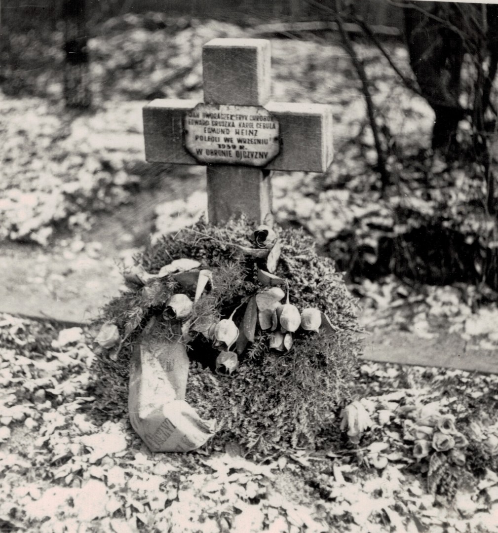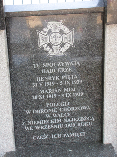 Na tym samym cmentarzu po prawej stronie wejścia głównego (zobacz plan pole zielone), znajduje się mogiła obrońców Chorzowa z września 1939 r. Pierwotnie były to skromne dwie połączone mogiły wykonane z betonowej opaski i drewnianego krzyża z umieszczoną na nim tablicą inskrypcyjną. W mogile pochowanych zostało dwóch chorzowskich harcerzy, obrońców Chorzowa z września 1939 r. Obecnie miejsce upamiętnione zostało trwałym pomnikiem wykonanym w 2016 r. w formie pionowych granitowych płyt, opaski oraz płyty dzielącej ułożonej płasko pośrodku grobu. Na środkowej pionowej płycie wygrawerowany został harcerski krzyż a pod nim inskrypcja: Tu spoczywają harcerze Henryk Pięta 31 V 1919 – 5 IX 1939; Marian Moj 20 XI 1919 – 3 IX 1939. Polegli w obronie Chorzowa w walce z niemieckim najeźdźcą we wrześniu 1939 roku. Cześć ich pamięci. Dodatkowe upamiętnienie znajduje się w miejscu ich śmierci na budynku przy ul. Stefana Żeromskiego i Wolności 44 gdzie umieszczono w 1946 r. granitową tablicę pamiątkową. Na tablicy obok H. Pięty i M. Moja widnieje jeszcze nazwisko Jana Marca, którego grobu dotychczas nie udało się zlokalizować.
