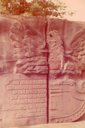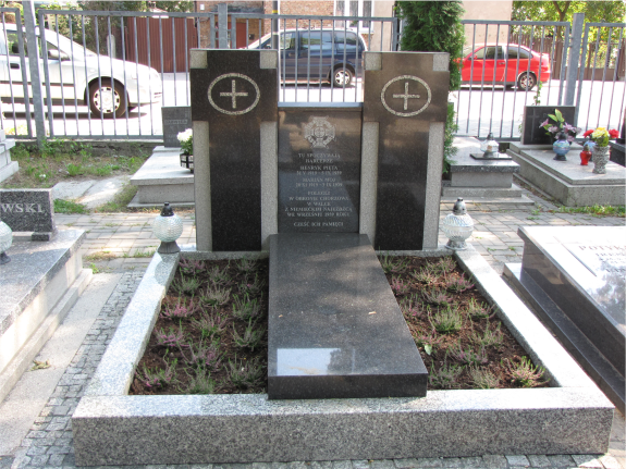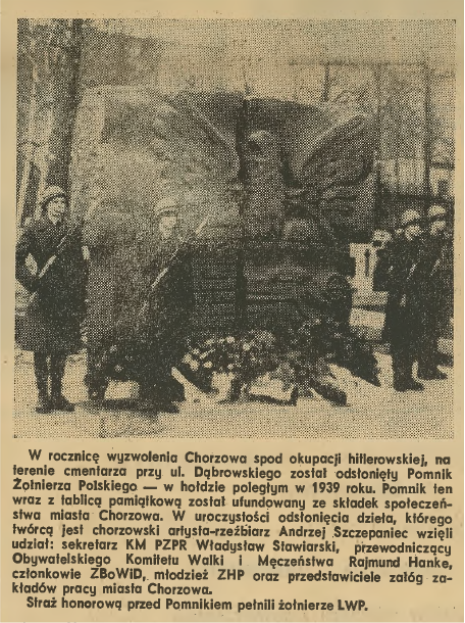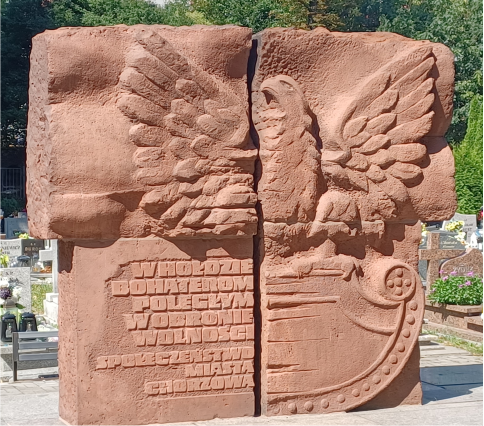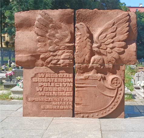Pomnik – grób Żołnierzy Polskich – zlokalizowany na cmentarzu parafialnym przy bocznym wejściu od strony kościoła pw Ducha Świętego (zobacz plan pole czerwone)[1] wykonany został z czerwonego piaskowca wg projektu artysty rzeźbiarza Andrzeja Szczepańca. Odsłonięty w 32. rocznicę wyzwolenia Chorzowa 28 I 1977 r. Pomnik ma formę płaskorzeźby składającej się z czterech pól tworzących w przecięciach formę krzyża. Trzy części przedstawiają żołnierskiego orła zaś czwarta w lewej dolnej części ma wyrytą inskrypcję: „W hołdzie bohaterom poległym w obronie wolności. Społeczeństwo miasta Chorzowa”.